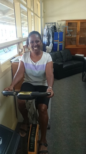 Lavenia giving the stationery bike a workout at lunchtime. Fantastic effort Lavenia!