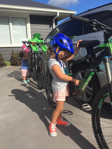 The girls doing last-minute bike inspections.